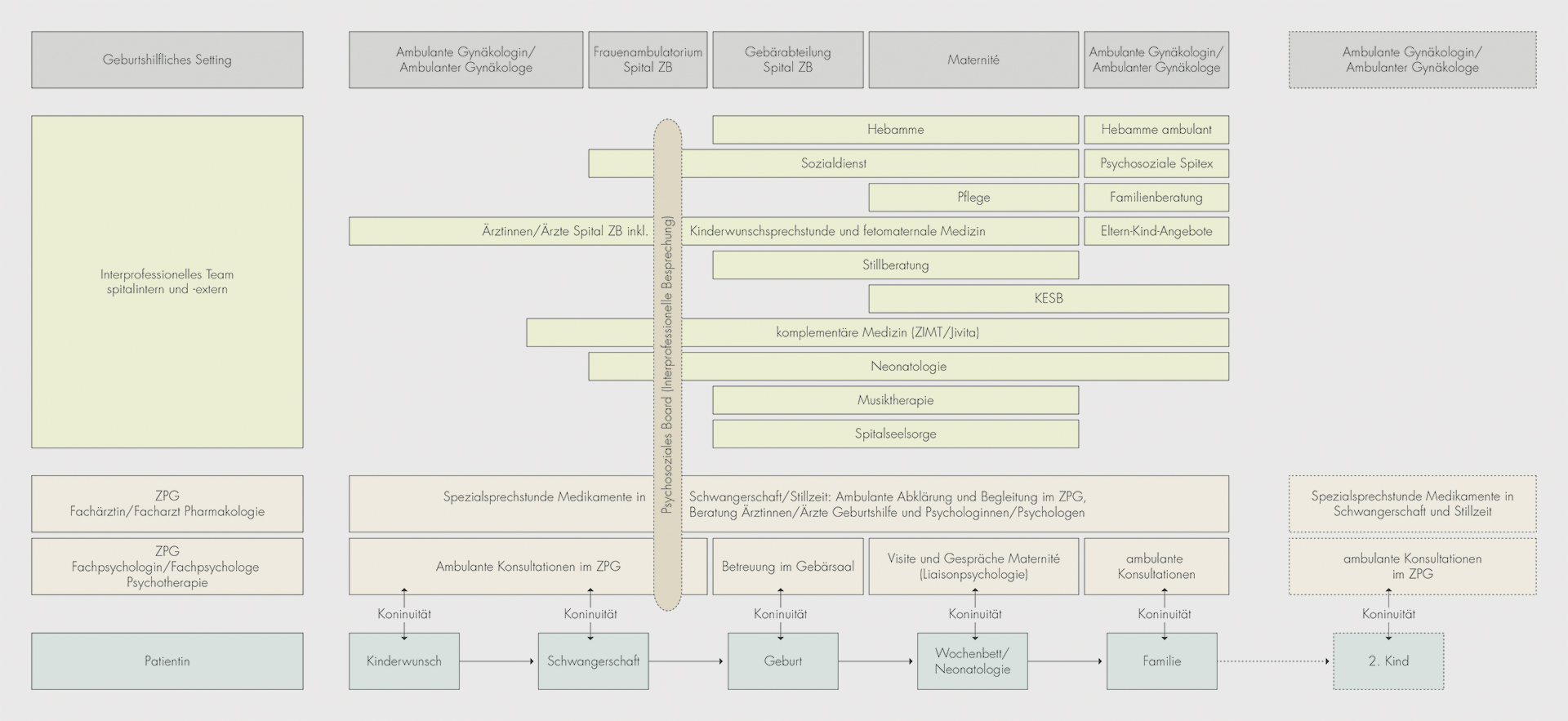 Frauen oder auch Paare werden von unseren Psychotherapeutinnen unter Umständen bereits während einer Phase des noch unerfüllten Kinderwunsches begleitet, während der Schwangerschaft im ambulanten Setting regelmässig gesehen und schliesslich im Gebärsaal und dem Wochenbett betreut. Im Anschluss an die Geburt kann eine weitere ambulante Begleitung erfolgen. Durch diese Behandlungskonstanz mit immer derselben Psychotherapeutin kann eine hohe Qualität und Patientenzufriedenheit erreicht werden. Neben der psychotherapeutischen Betreuung werden (werdende) Mütter bei komplexen medikamentösen Fragen durch unsere Fachärztin für Pharmakologie kompetent und ebenfalls kontinuierlich begleitet.